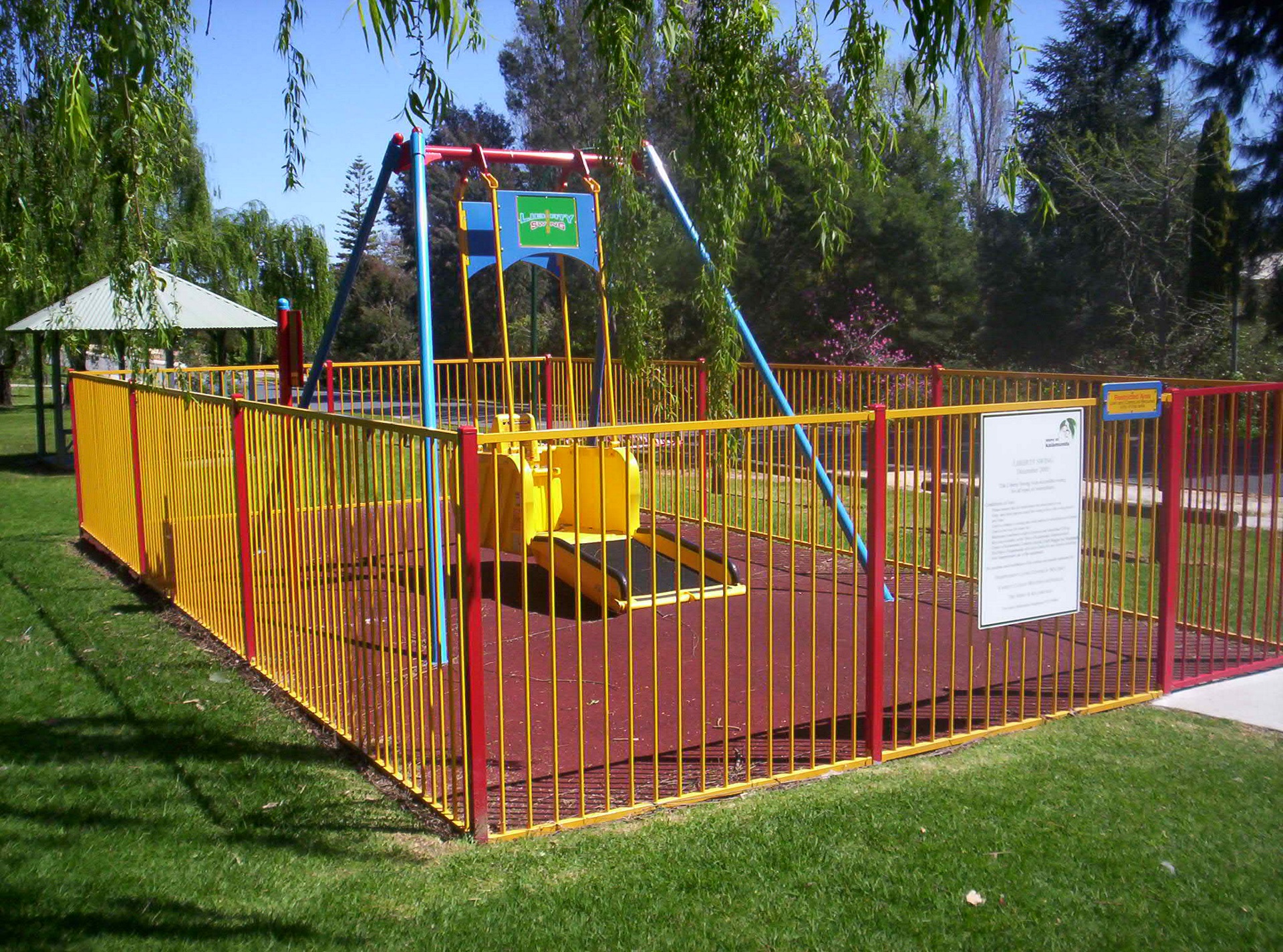 The Liberty Swing is an accessible swing for children who use a wheelchair. A key is required to access the swing and enclosure. Keys may be purchased or loaned from the City of Kalamunda at 2 Railway Road, Kalamunda, Zig Zag Cultural Centre or the Kalamunda Library, Williams Street, Kalamunda. The Liberty Swing has now been relocated to Fleming Reserve.