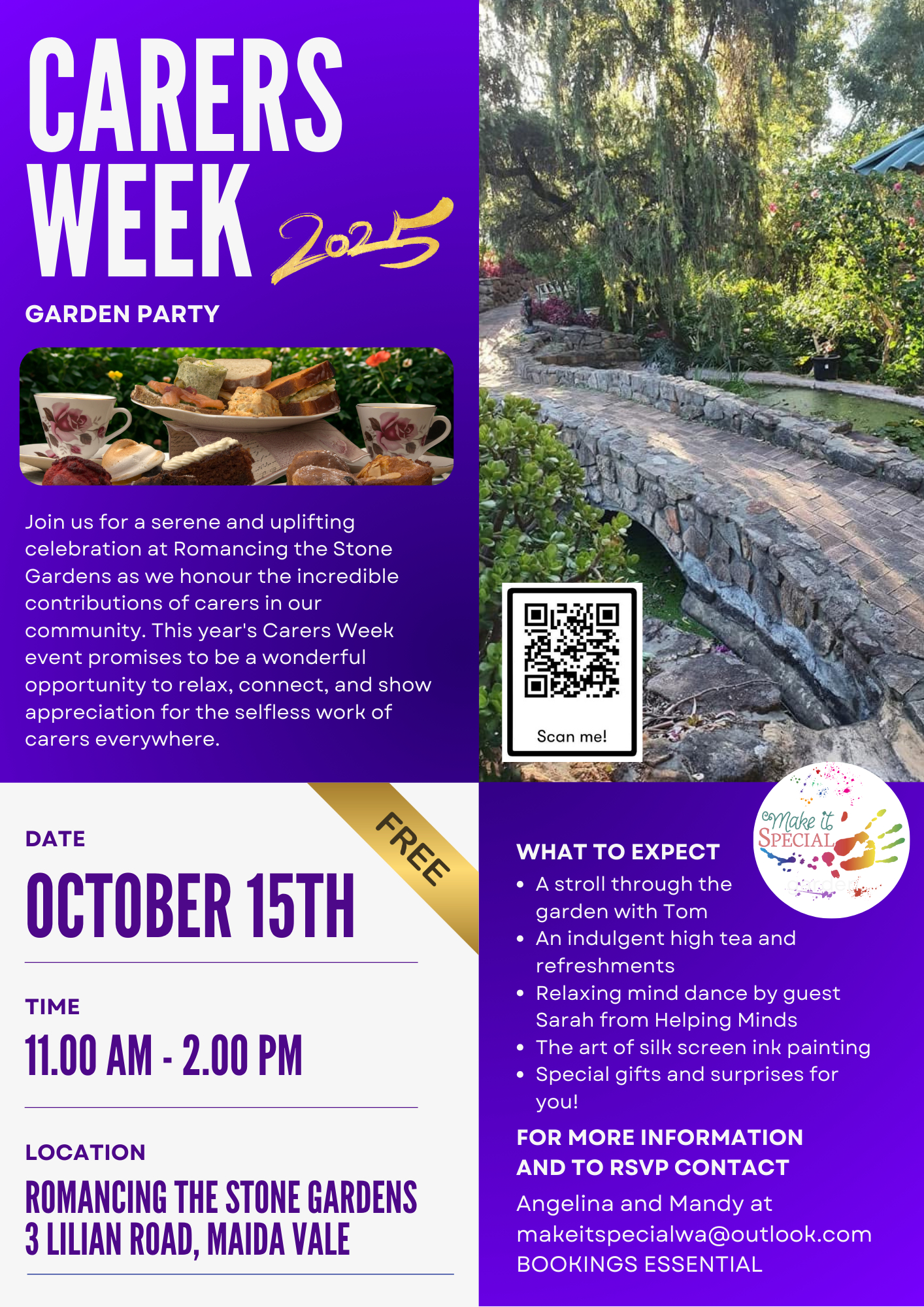 Welcome to the Carers Week High Tea Event for 2025 hosted by Make it Special! Join us at 3 Lilian Rd (Romancing The Stone Gardens) on October 15, 2025 at 11:00 AM for a day filled with fun and relaxation.